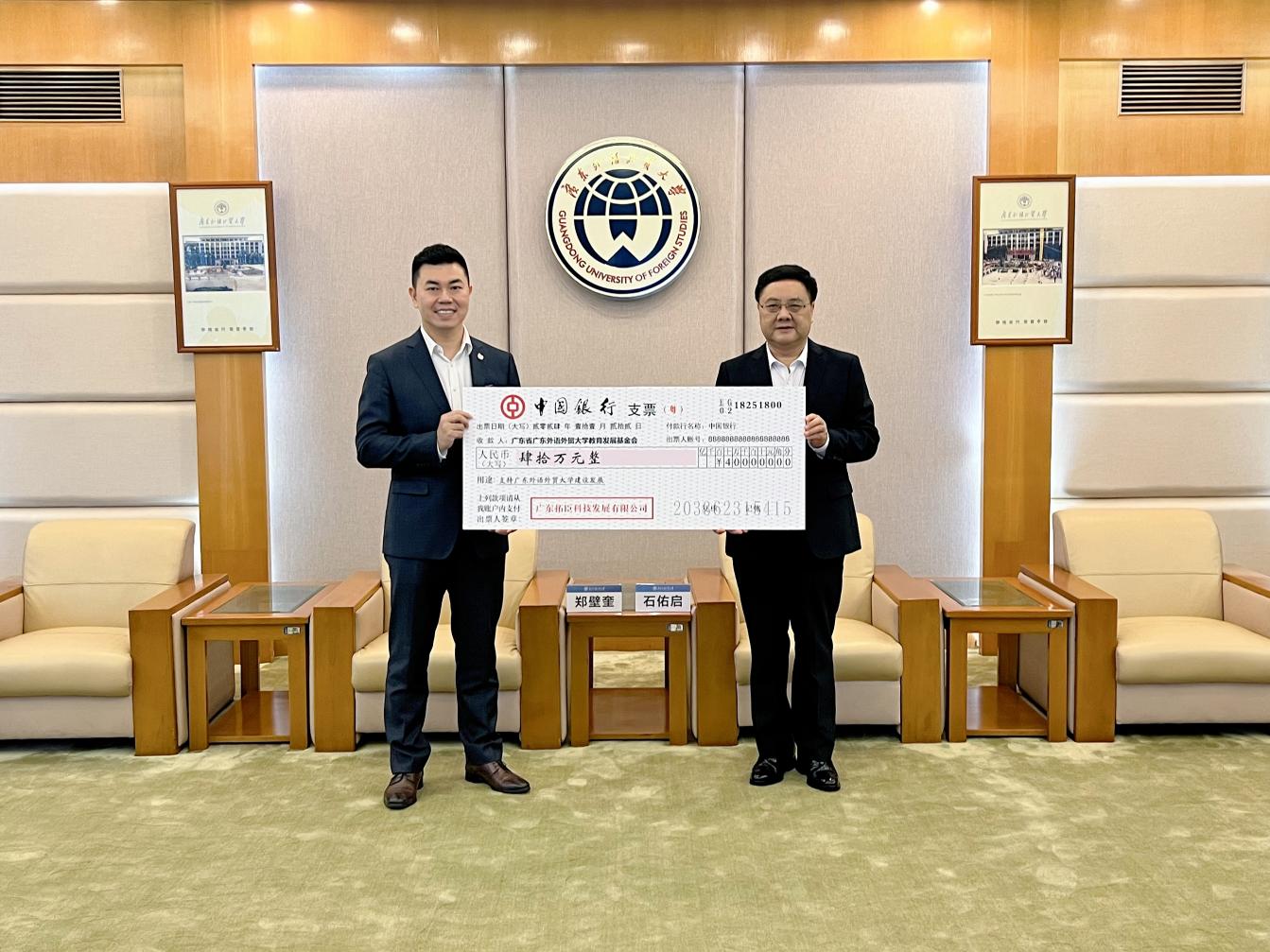 郑壁奎校友向基金会捐赠四十万元人民币,助力母校建设发展。石佑启代表基金会接受捐赠支票,并向郑壁奎校友回赠捐赠证书。