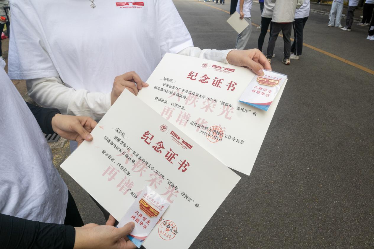 长跑结束后,学校为每一位参与者发放了活动纪念品——特别定制的60周年校庆徽章。徽章象征着广外六十年的光辉历程,也承载着每一位参与者对学校未来发展的祝福与期许。参与者们纷纷表示,这场活动不仅让他们在迎接新年的同时感受到了运动的魅力,也在这特别的时刻以这种特别的形式喜迎广外60周年华诞。
