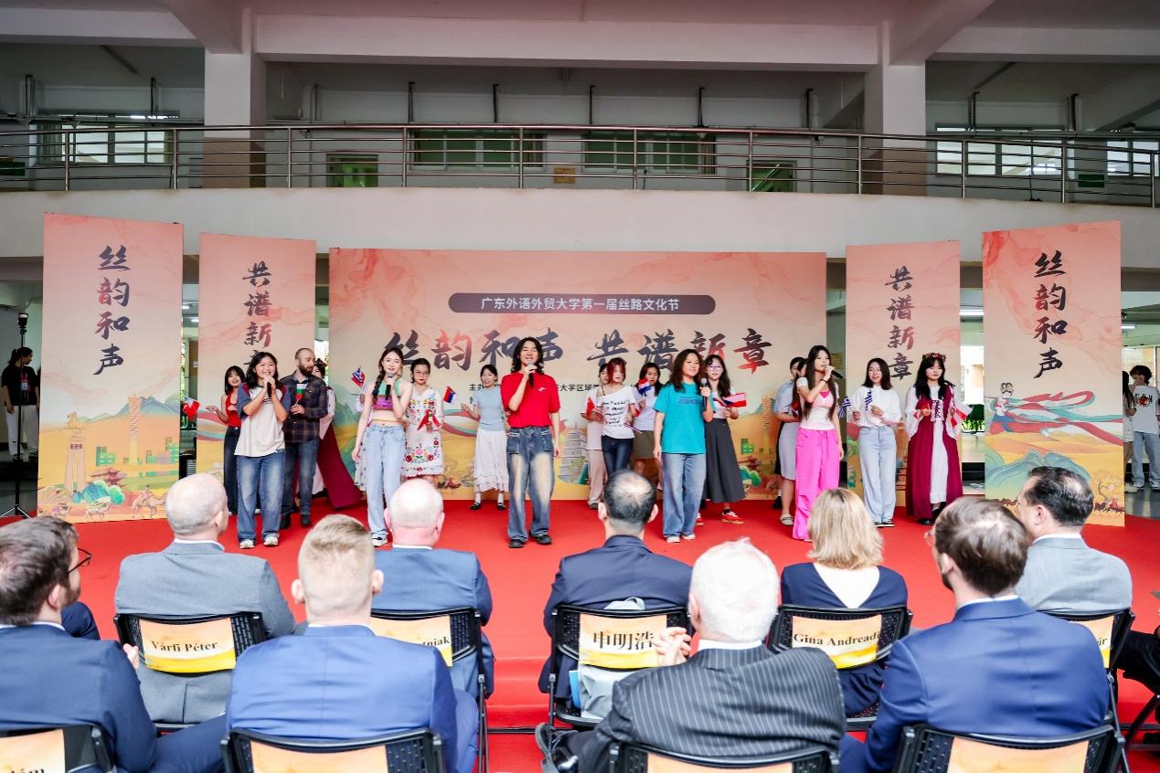 本网讯 5月29日下午,我校第一届丝路文化节在白云山校区开幕。本届文化节由区域国别学院(国际关系研究院)主办,以“丝韵和声,共谱新章”为主题,演绎“一带一路”最生动的当代叙事。副校长申明浩宣布文化节开幕。我校相关单位负责人,意大利、波兰、希腊、匈牙利、瑞士等5国驻穗总领事及代表,中国意大利商会,紫金矿业集团相关负责人,校友、师生200余人齐聚一堂,共同见证这场文化盛会。
