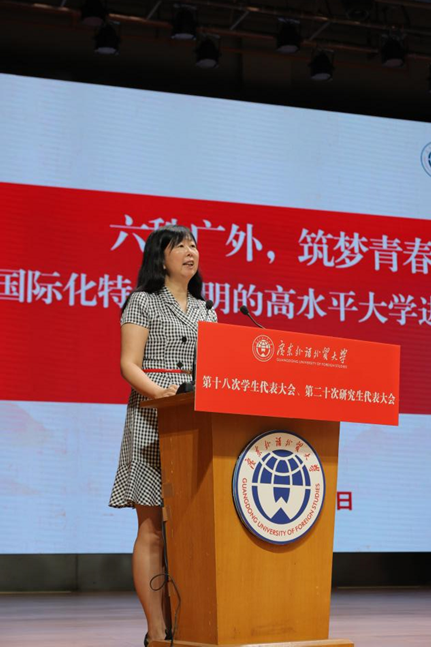 葛小月在致辞中向全体学生代表通报过去一年学校在学科发展建设、国际化人才培养等方面取得的显著成果,同时,勉励广外青年一是要胸怀家国,做思想引领、实干作为的“排头兵”;二是要心系发展,做爱校荣校、团结奋进的“主人翁”;三是要履职尽责,做服务同学、建言献策的“连心桥”;四是要坚守底线,做踏实诚恳、清澈纯粹的广外人。葛小月强调,学校和学生是发展共同体、情感共同体和荣誉共同体,希望学生代表在服务同学的过程中练就过硬本领,在服务发展的过程中实现自我提升,带领广外学子为建设国际化特色鲜明的高水平大学贡献青春力量。