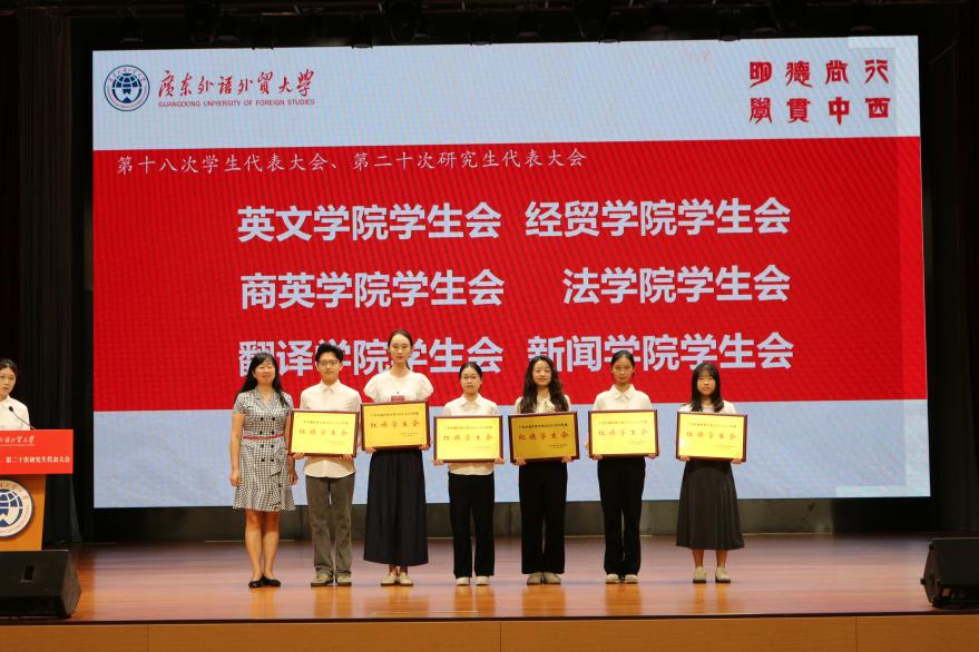 正式大会上,学生代表听取并审议通过校学生会、研究生会工作报告,学代会、研代会提案报告。经选举,英文学院莫非、英文学院欧阳佩轩、经贸学院陈欣怡、商英学院蔡玉兰当选为第十八届校学生会主席团成员,英文学院李柯漫,法学院李晓思,马克思主义学院张婉婷、翻译学院林晴当选第二十届校研究生会主席团成员。