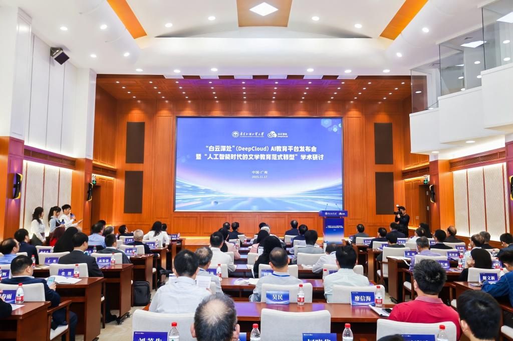 本网讯 11月17日,广东外语外贸大学白云山校区国际会议厅群贤毕至,“白云深处”(DeepCloud) AI教育平台发布会暨“人工智能时代的文学教育范式转型”学术研讨会隆重举行。本次活动由广东外语外贸大学英语语言文化学院主办,未来人文实验室、未来人文与中外文明交流互鉴研究院承办,既是广外建校60周年系列学术重头戏,更是新文科建设背景下人文与科技深度融合的生动实践。