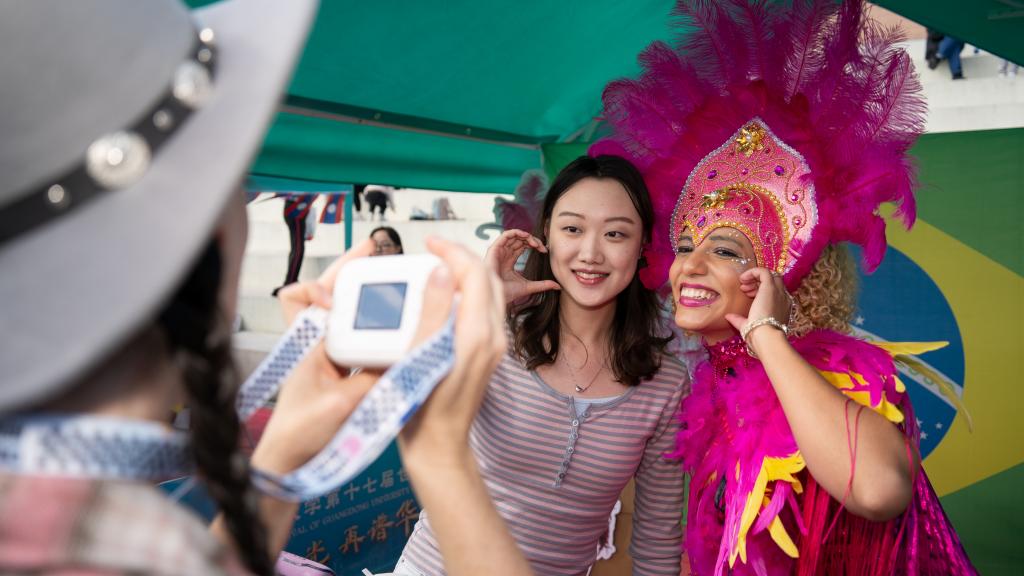 2017级亚非语言学院校友谢漫淇正与同行的伙伴分享来自日本的玉子仙贝,并不时停下脚步拍照留念。毕业多年,这是她首次重返母校参加世界文化节。“今年的活动规模比以往更大,校园也变得更美了!”她欣喜地说。