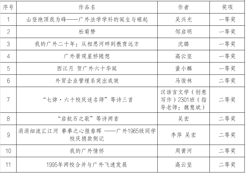 为记录广外不平凡的发展历程,探寻广外人共同的记忆,讲好广外奋斗故事,传承广外历史文化,学校举办“六秩芳华,印记广外”60周年校庆征文活动。活动启动以来,得到广大师生校友的积极响应与热情参与,经专家严格评审,评出11件获奖作品,现将获奖名单(同一奖项按姓氏笔画排序)公布如下。