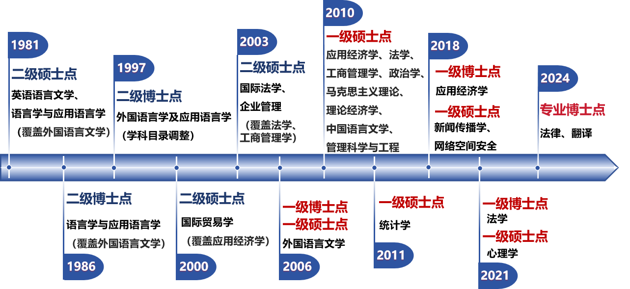 2018年,广外获批新增应用经济学一级学科博士点;2021年,获批新增法学一级学科博士点,并实现硕士点覆盖全校所有培养单位,中华文化国际传播学科被增列为高水平大学重点建设学科,学校入选广东省“冲补强”提升计划高水平大学重点建设高校,5个学科入选高水平大学重点建设学科。