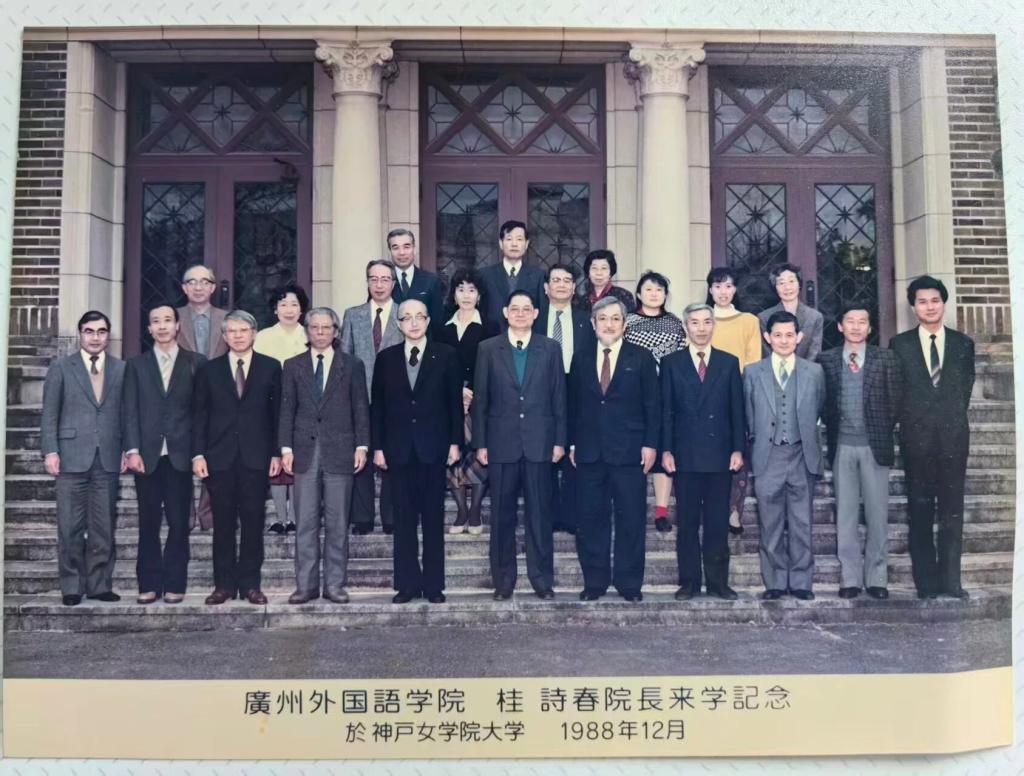 魏老师和桂诗春院长的接触起源于日本神户女学院大学。1988年12月中下旬,桂院长应神户女学院大学邀请,到日本进行了为期一周的访问。当时,魏老师正在日本神户女学院大学进行为期一年的访学。因此魏老师就负责起了安排桂院长来日访问的各种事务性工作,从办理赴日签证到购买机票等。按中日两校的协议,日方负担桂院长到日本后的一切费用。这样桂院长来日本机票费用需广外负担。当时神户女学院大学每个月发放“工资”给访学教师,按访学教师与广外的协定,访学教师需要交一部分提成款给广外。魏老师获学校授权使用提成款,用于购买桂院长的机票和为桂院长访日时拍照用的相机胶卷及付冲印费用。按日语专业有关领导的意思,还可用一定金额用于给桂院长购买礼物等。但到访日本的桂院长不但没有这样的要求,还多次婉拒了魏老师主动提出购买一些礼物的建议。结束访学回到广外的魏老师只是按给桂院长的唯一要求,给他送去了几十张彩色纪念照片。魏老师自己至今还保存着十几张,因60周年校庆需要,魏老师曾给日语学院提供过若干张。